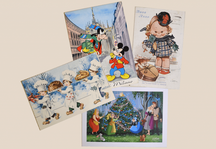 Cartoline e biglietti d’auguri si colorano delle atmosfere tipiche del Natale: paesaggi innevati, scene di famiglia, alberi addobbati. Un momento magico per tutti