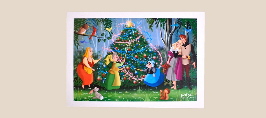 Si discosta dalle precedenti la quarta cartolina che, pur ritraendo differenti personaggi dei cartoni animati, non contiene la raffigurazione del panettone. Nell’immagine i personaggi de La bella addormentata nel bosco sono raccolti attorno ad un albero di Natale che viene magicamente addobbato. Proprio la magia di questo periodo è quella che unisce il mondo ideale a quello immaginario dei bambini, amplificando così tutto il fascino che da sempre questa festa produce nei loro occhi.