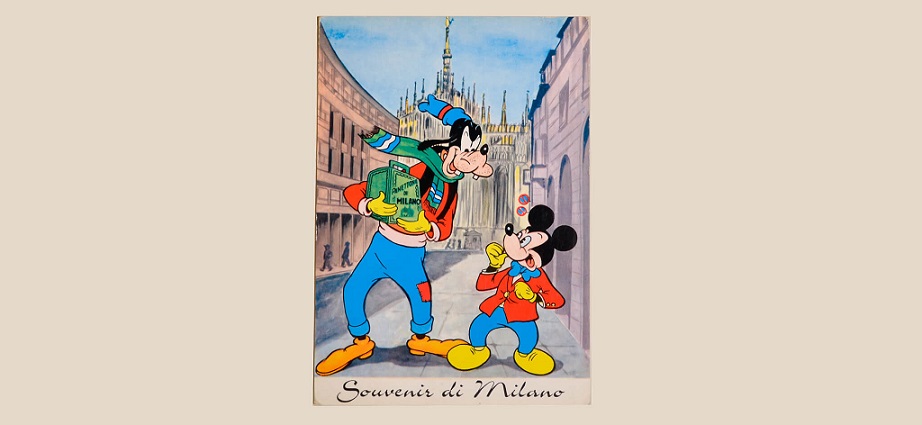 Tuttavia, le cartoline destinate ai più piccoli possono avere come protagonisti personaggi dei cartoni animati; è il caso degli ultimi due esemplari. La terza cartolina è un curioso souvenir di Milano, con protagonisti Pippo e Topolino, turisti nella città metropolitana. Due sono gli elementi caratteristici e ben visibili: il Duomo sullo sfondo con le sue guglie e il panettone, simbolo del capoluogo lombardo e della sua storia produttiva e dolciaria.
