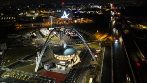 All’esterno è stato mantenuto l’enorme tripode ad arco originale, icona storica dell’edificio e progettato per essere visibile da lontano. Oggi, riprendendo l’idea originaria di illuminazione esterna della struttura, nel tripode sono state installate luci a LED, che ne aumentano la visibilità nelle ore notturne e che potranno variare di colore a seconda delle occasioni.