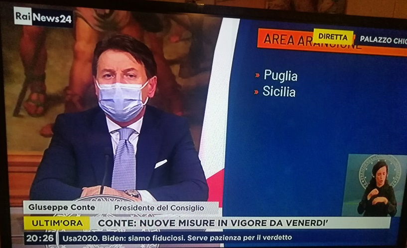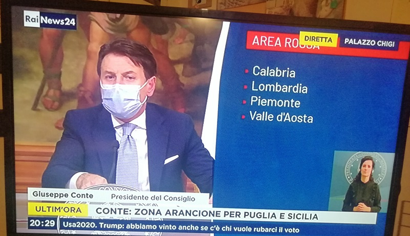 La video conferenza del premier: “Lombardia, Piemonte, Calabria e Valle d’Aosta sono in area rossa, Puglia e Sicilia in quella arancione”