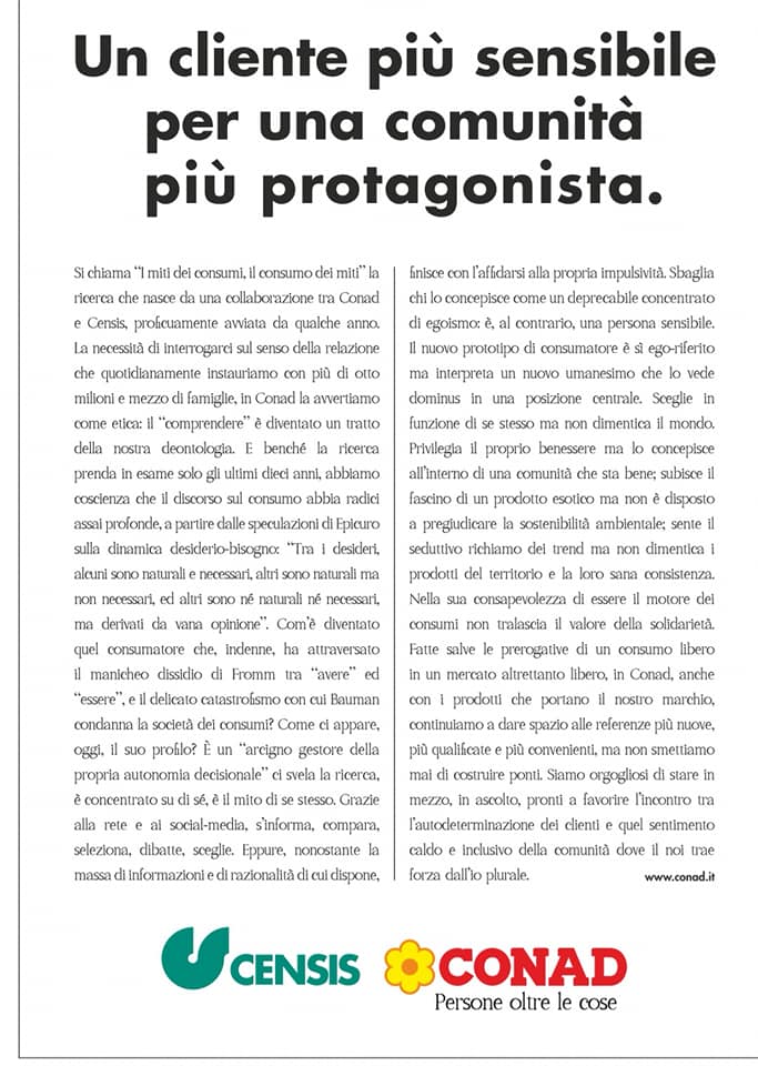 Da questa riflessione emerge quel “nuovo umanesimo” messo in rilevo nella comunicazione Conad con il manifesto “Un cliente più sensibile per una comunità più protagonista”.