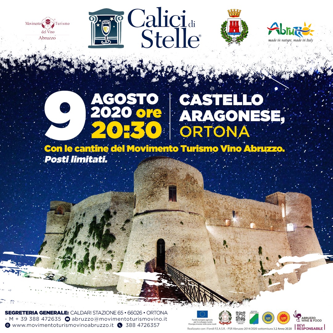 Data assolutamente da segnare in rosso sul calendario quella di domenica 9 Agosto quando per il terzo anno consecutivo oltre 30 cantine di MTV Abruzzo organizzeranno quella che probabilmente è la serata più importante del vino abruzzese: Calici di Stelle nel Castello Aragonese di Ortona.