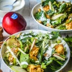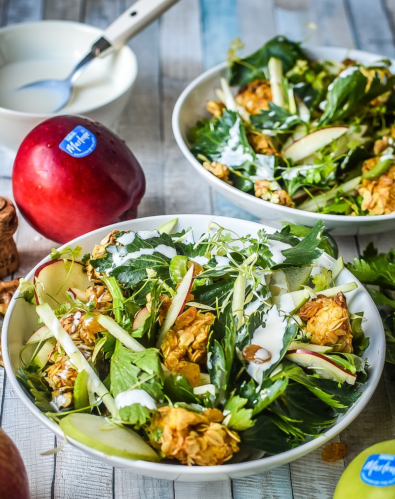 Insalata verde Waldorf con pollo croccante, sedano, noci, mela e salsa di spumante
