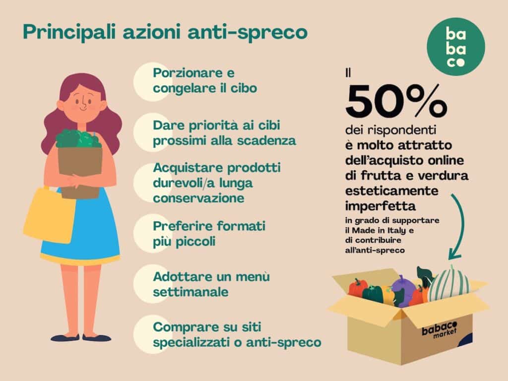 Per quanto riguarda invece le principali azioni anti-spreco attuabili, nella ricerca commissionata da Babaco Market rientrano il porzionamento e il congelamento del cibo (46%), il dare priorità ai cibi prossimi alla scadenza (38%), l’acquisto di prodotti durevoli/a lunga conservazione (37%) o di formati più piccoli (30%), l’adozione di un menù settimanale (25%) e l’acquisto su siti specializzati vs anti-spreco (8%).