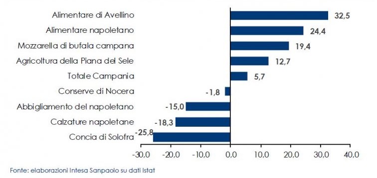 Ottime le performance dell’Alimentare di Avellino (+32,5%) e di quello napoletano (+24,4%), mentre segnano una flessione le Conserve di Nocera (-1,8%) e subiscono ancora un forte arretramento le Calzature napoletane (-18,3%) che risentono del ripiegamento delle esportazioni nelle principali destinazioni commerciali europee.
