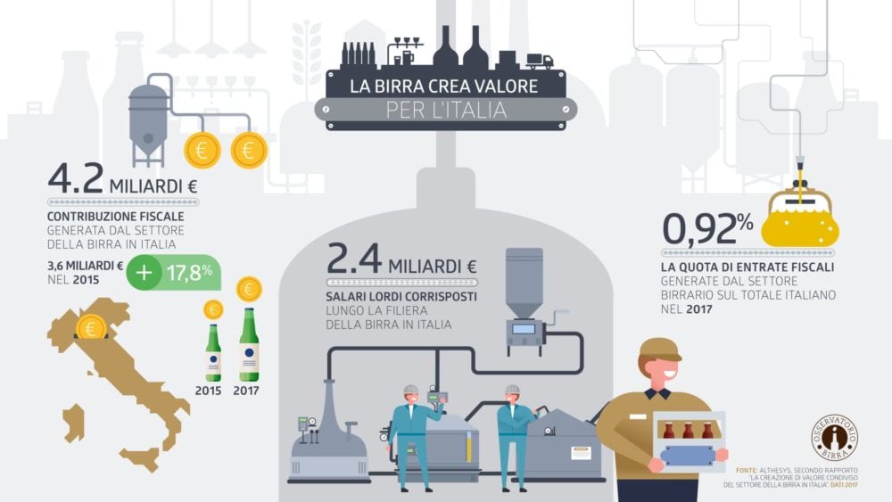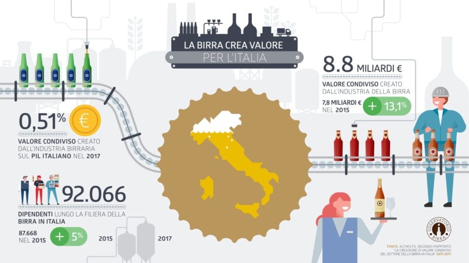 I dati sono stati diffusi dall’Osservatorio Birra con la presentazione del 2° Rapporto “La creazione di valore condiviso del settore della birra in Italia” realizzato da Althesys per conto della Fondazione Birra Moretti, fondazione di partecipazione costituita nel 2015 da Heineken Italia e Partesa al fine di contribuire alla crescita della cultura della birra in Italia.
