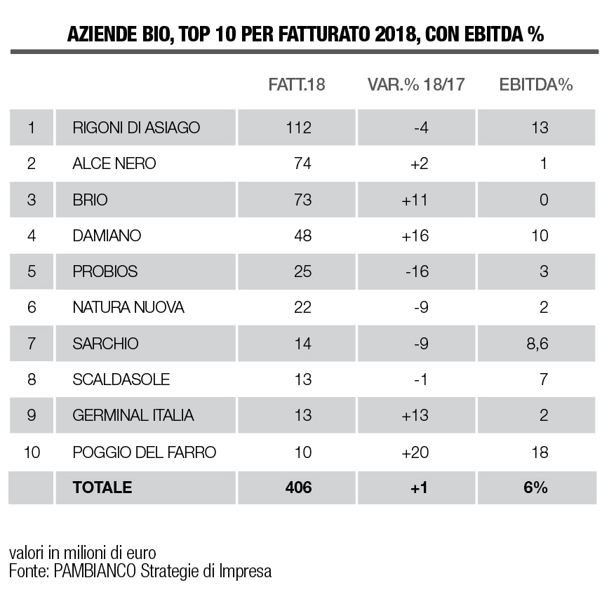 Il leader italiano del biologico è Rigoni di Asiago, con 112,5 milioni di ricavi realizzati al termine di un anno caratterizzato da un lieve calo di vendite, ma durante il quale l’azienda vicentina amministrata da Andrea Rigoni ha posto le basi per la propria crescita futura, inserendo il nuovo socio Kharis Capital (con quota di minoranza rafforzata) in sostituzione del Fondo Italiano di Investimento per poi ottenere, a marzo 2019, un finanziamento di 50 milioni di euro da un pool di banche che verrà utilizzato per potenziare l’export, che vale attualmente quasi il 40% del fatturato complessivo.