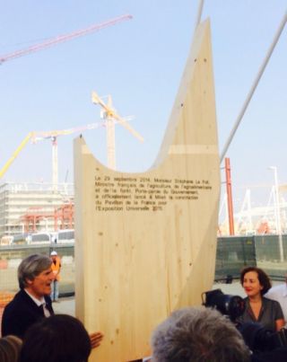 Lo scorso 29 settembre la posa della prima pietra da parte del ministro francese dell’Agricoltura Stéphane Le Foll, accompagnato dall’omologo italiano Maurizio Martina, Ministro delle politiche agricole, alimentari e forestali. Presenti anche il governatore della Lombardia, Roberto Maroni, e l’assessore al lavoro del comune di Milano, Cristina Tajani. Più che una pietra si è però posato un tassello in legno lamellare proveniente dalla regione Jura, primo elemento di una struttura ecosostenibile, completamente smontabile e rimontabile, che si ispira a quello di una halle, mercato coperto alla francese.