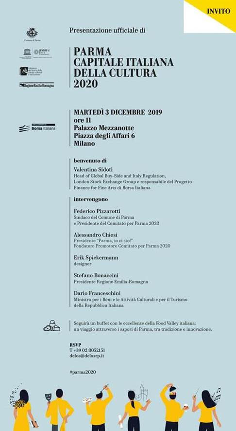 La presentazione si è svolta oggi, 2 dicembre, a Parma proprio mentre a Milano domani presso Palazzo Mezzanotte (piazza degli Affari) alla presenza del Ministro per i Beni e le Attività Culturale e per il Turismo, Dario Franceschini, si terrà la conferenza stampa di avvio dell’anno di Parma quale Capitale italiana della Cultura 2020.