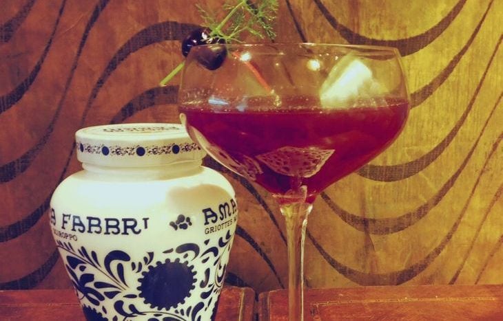 Gli ingredienti del cocktail: un sapiente mix di rum, Vecchia Romagna con infusione di caffè Cold Brew, riduzione di lambrusco, sciroppo di Amarena ed estratto di ananas.