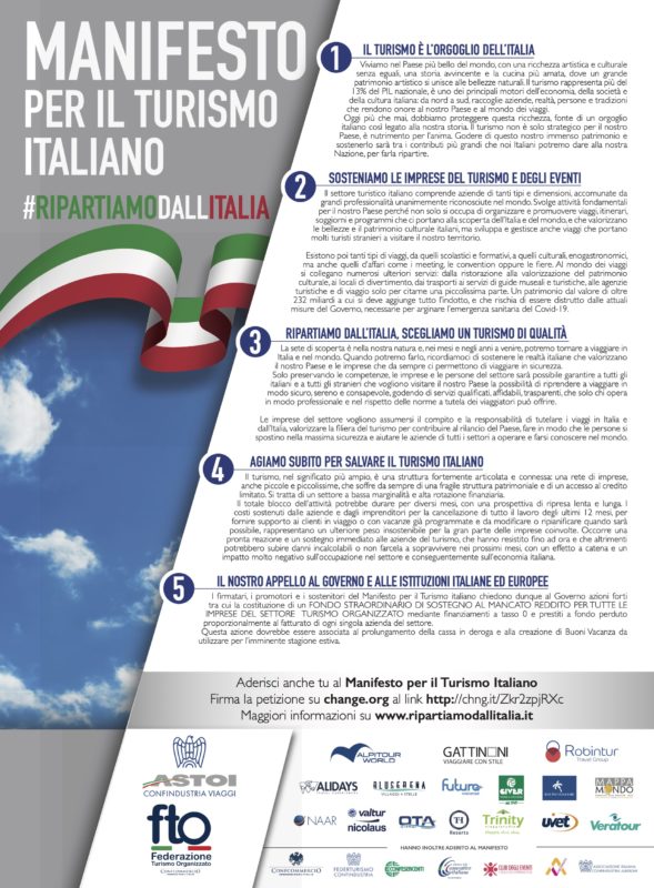 “Le imprese del settore – affermano i promotori del Manifesto per il Turismo Italiano – vogliono assumersi il compito e la responsabilità di tutelare i viaggi in Italia e dall’Italia, valorizzare la filiera del turismo, della ristorazione e del tempo libero per contribuire al rilancio del Paese, fare in modo che le persone si spostino nella massima sicurezza e per aiutare le aziende di tutti i settori a operare e farsi conoscere nel mondo”.