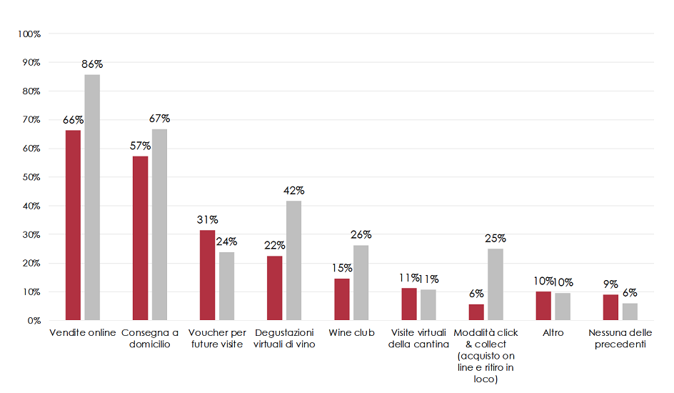 Ben il 31% delle aziende intervistate ha dichiarato cali nella vendita di servizi turistici superiori al 70% rispetto al medesimo periodo dell’anno precedente. Per far fronte alla grave crisi che ha colpito il settore durante e dopo il lockdown, il 66% si è affidato alla vendita online, il 57% alla consegna a domicilio, il 31% a voucher per future visite e 22% alle degustazioni virtuali.