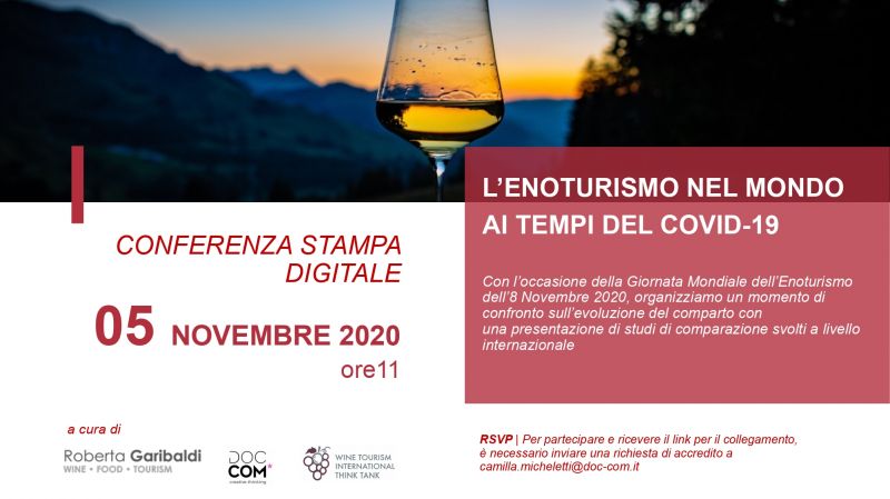 Questa mattina, 5 Novembre, Roberta Garibaldi, presidente dell’Associazione Italiana Turismo Enogastronomico, e l’agenzia di comunicazione DOC-COM hanno organizzato un webinar per discutere sulle prospettive dell’enoturismo durante la pandemia di COVID-19. Al dibattito hanno partecipato Nicola D’Auria, presidente nazionale Movimento del Turismo del Vino, Donatella Cinelli Colombini, presidente nazionale Donne del Vino, e Paolo Privitera, CEO di Evensi, professore al MIT di Boston.