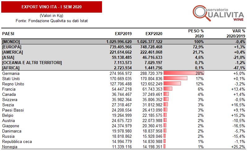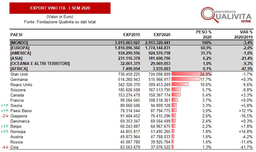 Raggiungono quota 2,91 miliardi di euro le esportazioni di vino italiano nel primo semestre 2020, un risultato che segna un -3,4% rispetto all’analogo periodo 2019 (anno record in cui per la prima volta si erano superati i 3 miliardi di euro di export nei primi sei mesi): è quanto emerge dalle elaborazioni dell’Osservatorio Qualivita Wine su dati Istat, che descrivono un primo semestre 2020 con livelli di export simili al 2018 (per un -0,4% rispetto ai 2,92 miliardi 2018) e decisamente superiori a quelli del 2017 (con un +3,3% rispetto ai 2,82 miliardi del 2017).