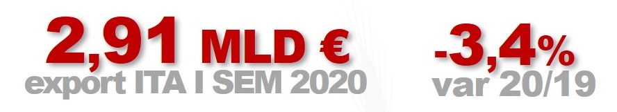 Il risultato è frutto di andamenti contrapposti fra il primo e il secondo trimestre dell’anno: il 2020 era iniziato in maniera estremamente positiva rispetto al già ottimo 2019, con un +6,2% nel primo trimestre (1,53 miliardi nei primi tre mesi 2020 rispetto a 1,44 nel 2019), mentre dal mese successivo si sono iniziati a sentire in maniera più forte gli effetti dell’emergenza Covid-19 con un calo delle esportazioni (aprile -6,0%, maggio -24,2%, giugno -4,3%) per un risultato complessivo del -12,1% nel secondo trimestre (1,29 miliardi nel 2020 rispetto a 1,58 miliardi nell’analogo periodo 2019).