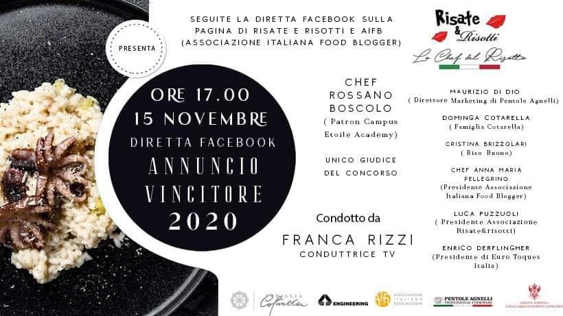 Domenica 15 novembre alle ore 17 sulla pagine facebook di Risate&Risotti e dell’Associazione Italiana Food Blogger lo chef Rossano Boscolo, patron del Campus Etoile Academy, svelerà il nome dello chef vincitore dell’edizione 2020. (Nella foto di copertina: Luca Puzzuoli, Maurizio Battista e Moreno Nazzaretto).