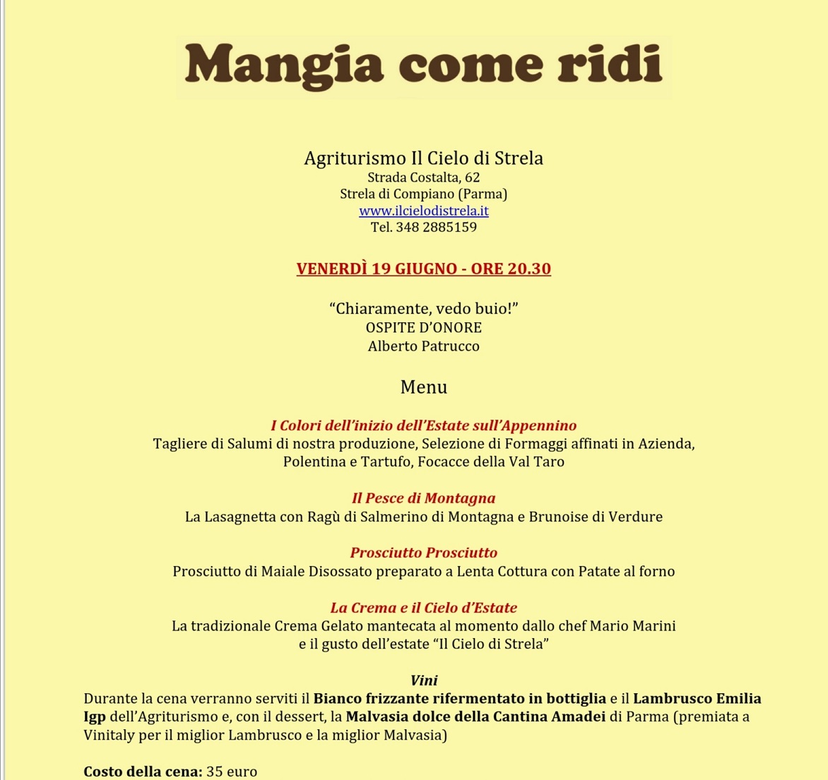 Dopo essere stato assessore alla Cultura a Parma, Mario Marini (attualmente presidente di Confagricoltura Parma e dei Musei del Cibo) nel 2014 ha avviato l’agriturismo Il Cielo di Strela (www.ilcielodistrela.it). La splendida struttura di Strela di Compiano accoglierà il pubblico di Mangia come ridi con la sua straordinaria vista sul Monte Pelpi e con un menu firmato dallo chef Marini, che, tra le varie portate, proporrà specialità come le lasagnette al ragù di salmerino di montagna e un delizioso prosciutto a lenta cottura. Senza dimenticare l’immancabile chiusura in dolcezza con il sorprendente e fresco gelato al gusto “Il Cielo di Strela”.