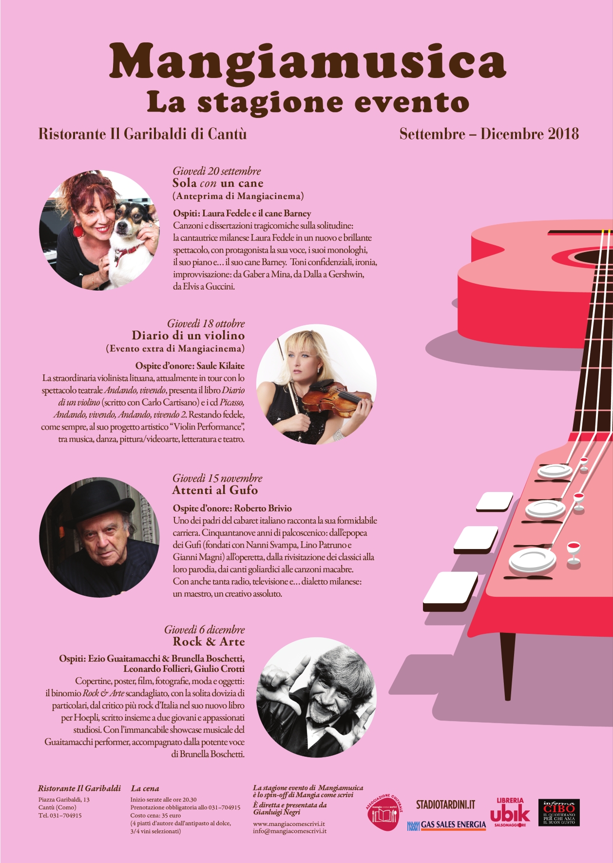 Ecco perché anche quest’anno le serate di settembre e ottobre, sia di Cantù che di Parma, sono gemellate con Mangiacinema: le due anteprime con Laura Fedele (il suo piano e… il suo cane Barney) e con i romanzieri storici Franco Forte e Patrizia Debicke van der Noot, i due eventi extra con la violinista lituana Saule Kilaite e con gli scrittori noir Valerio Varesi, Paolo Roversi e Romano De Marco. Poi a Cantù Roberto Brivio con la storia dei Gufi e Ezio Guaitamacchi (con Brunella Boschetti, Leonardo Follieri e Giulo Crotti in “Rock & Arte”).