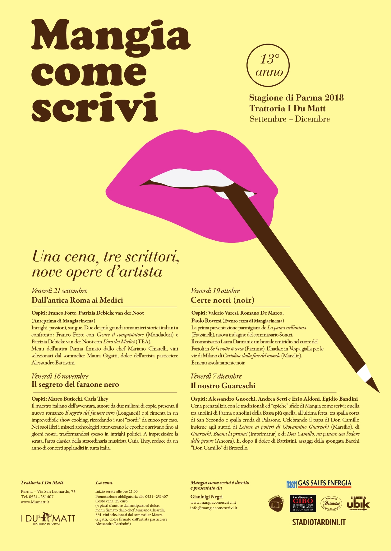 A settembre riprenderanno le due stagioni, quella emiliana e quella lombarda, della rassegna creata e diretta dal giornalista Gianluigi Negri: le cene-spettacolo si svolgeranno a Cantù (Como) un giovedì al mese al Ristorante Il Garibaldi e a Parma un venerdì al mese alla Trattoria I Du Matt, nuovo locale molto accogliente e vicinissimo all’autostrada.