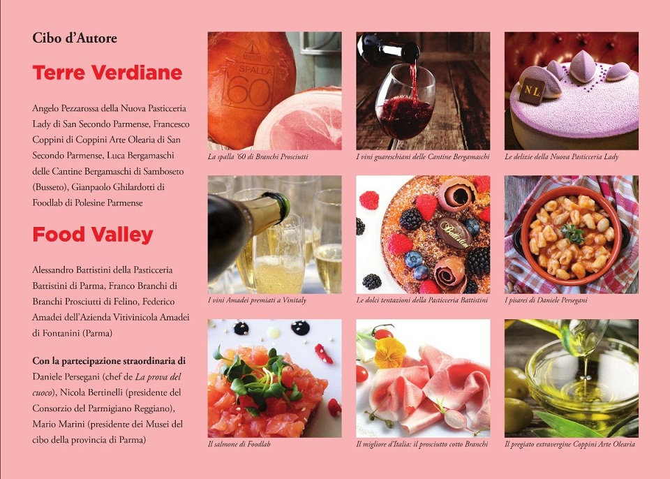 Per la Food Valley, la monoporzione Mangiacinema del maestro pasticciere Alessandro Battistini (Pasticceria Battistini di Parma), il Cotto ’60 (miglior cotto italiano per “Gambero Rosso”), la Spalla ’60 e una novità di queste ultime settimane di Franco Branchi (Branchi Prosciutti di Felino), i vini premiati a Vinitaly di Federico Amadei (Azienda Vitivinicola Amadei di Fontanini di Parma).