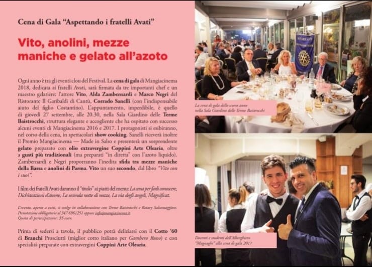 La cena di gala di MangiacinemaGiovedì 27 settembre alle 20.30 le Terme Baistrocchi ospiteranno la cena di gala di Mangiacinema, uno degli eventi clou della manifestazione dedicata al cibo d’autore e al cinema goloso. Il tema della cena, a cura degli chef Vito, Alda Zambernardi e Marco Negri e dal mastro gelatiere Corrado Sanelli, è “Aspettando i fratelli Avati“: i loro film daranno il titolo ai piatti del menu.