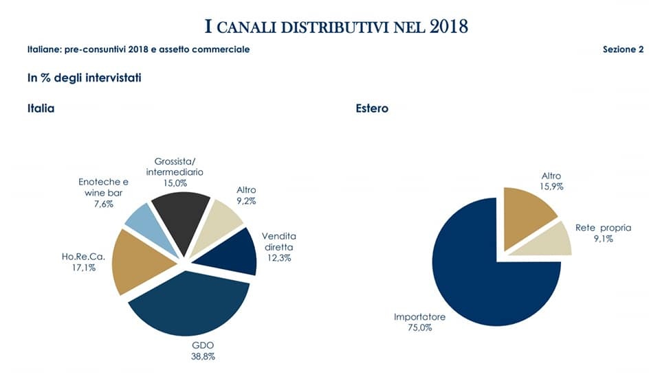 Domina la Grande Distribuzione Organizzata (Gdo), che interessa il 38,8% delle vendite. Seguono l’Ho.Re.Ca. (17,1%), grossisti e intermediari (15%) e la rete diretta (12,3%). Sui mercati esteri non ha rivali l’intermediario importatore (75%), evidenziando un punto di potenziale debolezza nel presidio diretto delle vendite.