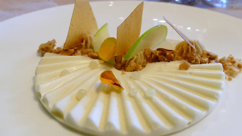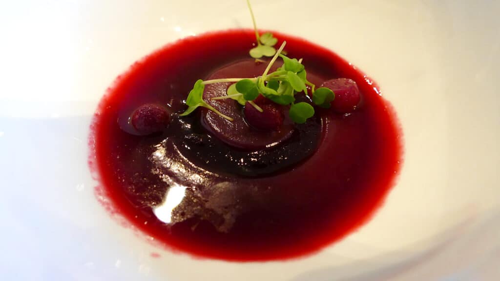 Anche i piatti vegani trovano ampio spazio, con un menù di assaggi che esplora sapori e consistenze insoliti, come il Risotto Matisse con arrosto di sedano rapa, frolla alle castagne, ribes nero, lampone e spuma al tè Oolong.