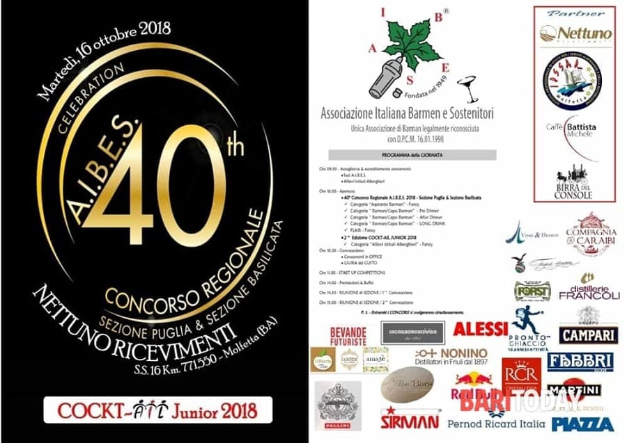 Sfida a colpi di shaker martedì 16 ottobre a Molfetta. Alle ore 10, nelle sale di Nettuno ricevimenti, faranno tappa il quarantesimo Concorso Regionale A.I.B.E.S. sezione Puglia & sezione Basilicata e la seconda edizione di Cockt-AIL Junior.