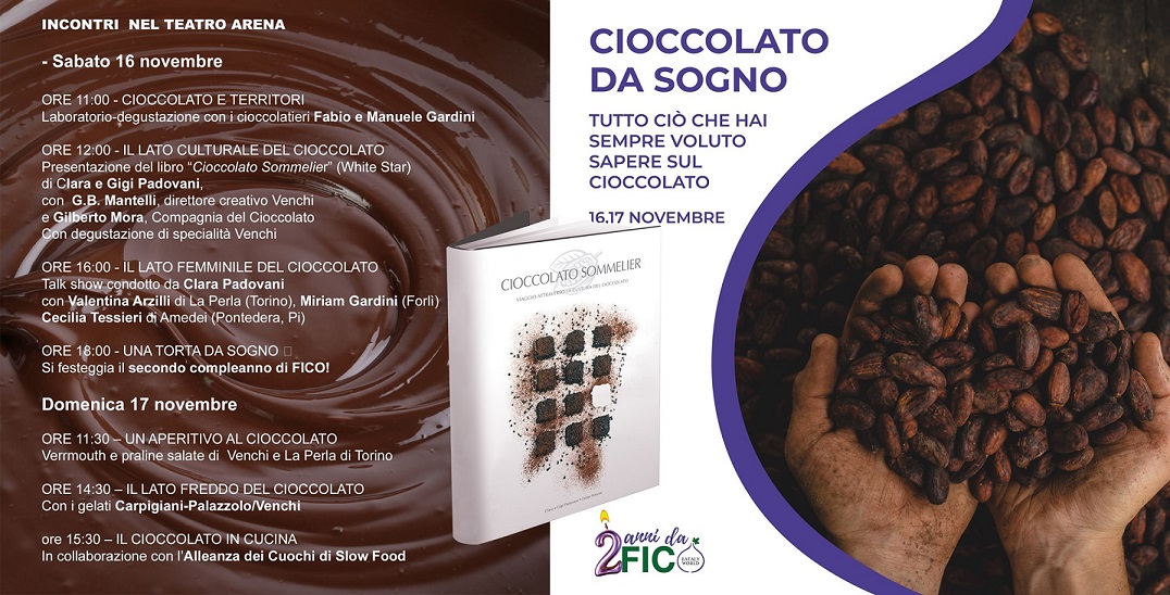 Al Parco del cibo di Bologna si sono svolte molte iniziative, in mattinata la presentazione del libro “Cioccolato Sommelier” di Carla e Gigi Padovani e, nel pomeriggio dopo l’incontro, Il lato femminile del Cioccolato, sono stati  festeggiati i due anni del Parco del cibo alla presenza, tra gli altri, dell’amministratore delegato Tiziana Primori che ha illustrato gli obiettivi raggiunti e le proposte per il futuro del parco bolognese e infine il gran finale con tanti dolci e una golosissima “torta da sogno” a più piani.