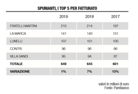 Comanda pertanto la piemontese Fratelli Martini con 210 milioni, davanti alla coop trevigiana La Marca con 141 milioni e al gruppo trentino Ferrari/Lunelli che invece è in controtendenza, grazie al posizionamento alto, e si porta a 107 milioni. A seguire, la veronese Contri, stabile con 96 milioni, e Villa Sandi che incalza a quota 95 milioni.