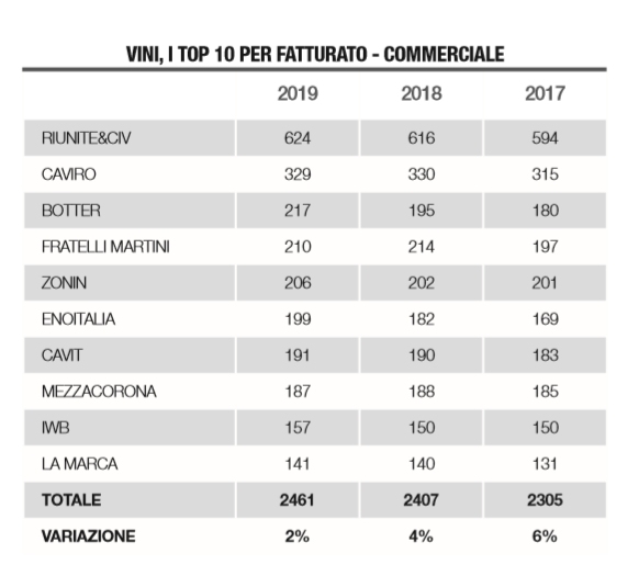 Cantine Riunite & Civ si conferma anche nel 2019 leader assoluto con 624 milioni di ricavi, otto in più del 2018; il motore è stato rappresentato dalla controllata Gruppo Italiano Vini, che con i suoi 19 marchi di fascia medio/alta e alta ha raggiunto da sola un fatturato di 406 milioni contro i 388 dell’esercizio precedente. Questo il primo dato dell’analisi di Pambianco sui fatturati dei primi dieci gruppi del vino tricolore, diffusi oggi.