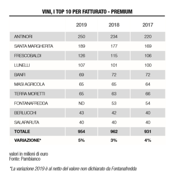 La classifica dei produttori di fascia alta è invece priva di variazioni, in termini di posizione della top10, ma si nota un trend differente dei primi quattro gruppi a confronto con quelli che occupano le posizioni successive. In sostanza, oltre ad Antinori, sono cresciuti high single digit l’inseguitore Santa Margherita, da 177 a 189, e Frescobaldi che consolida la terza posizione, da 115 a 126. In evidenza anche Lunelli, quarto con 107 milioni (+6%). Dal quinto posto in poi troviamo realtà stabili, altre in lieve flessione o in lieve ascesa, ma il saldo attivo dipende in ogni caso dalle posizioni di vertice.