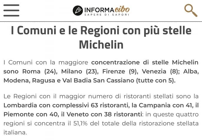 In Italia gli stellati sono 356, vale a dire: 9 ristoranti tre stelle, 41 ristoranti due stelle, e 306 ristoranti con una stella.
