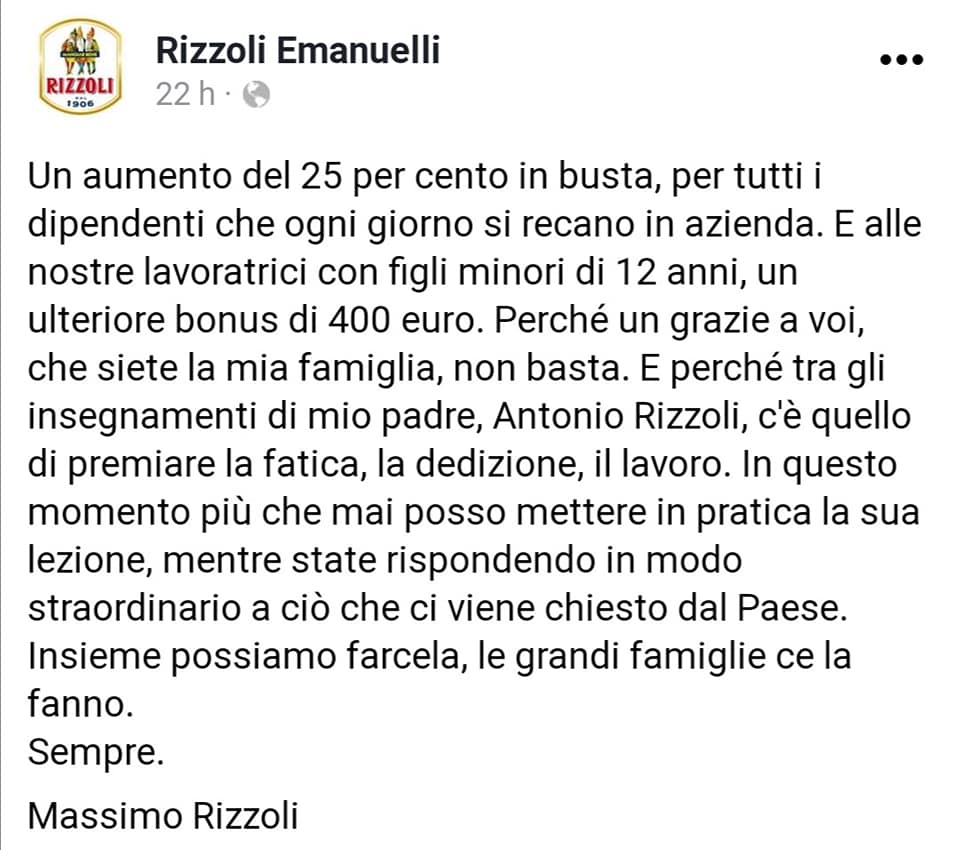 Uno speciale premio che ammonta al 25% della retribuzione. Massimo Rizzoli: "In questo periodo critico, la salute e il benessere dei dipendenti sono per noi priorità assoluta