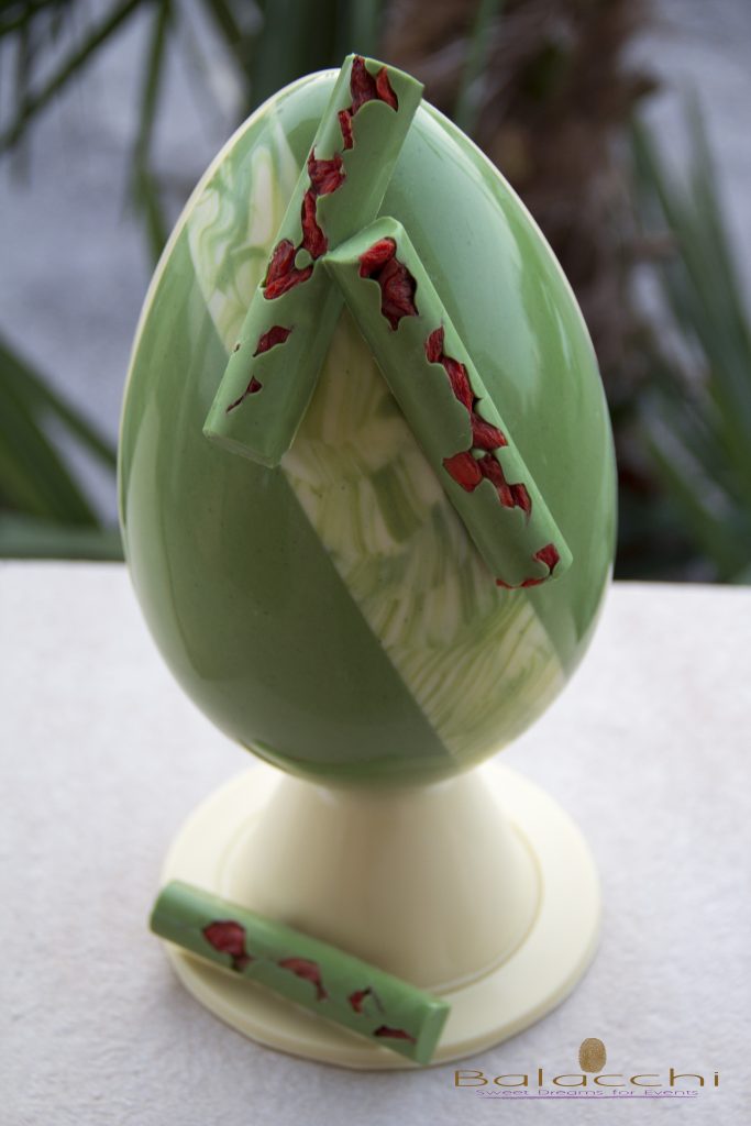 L’uovo di cioccolato firmato Stefano Laghi, di Padova, si schiude lasciando affiorare golosità: “Il segreto è l’utilizzo della frutta secca, impiegata in varie maniere. Spinta creativa e proposta salutistica sono le due grandi qualità di questa frutta.”