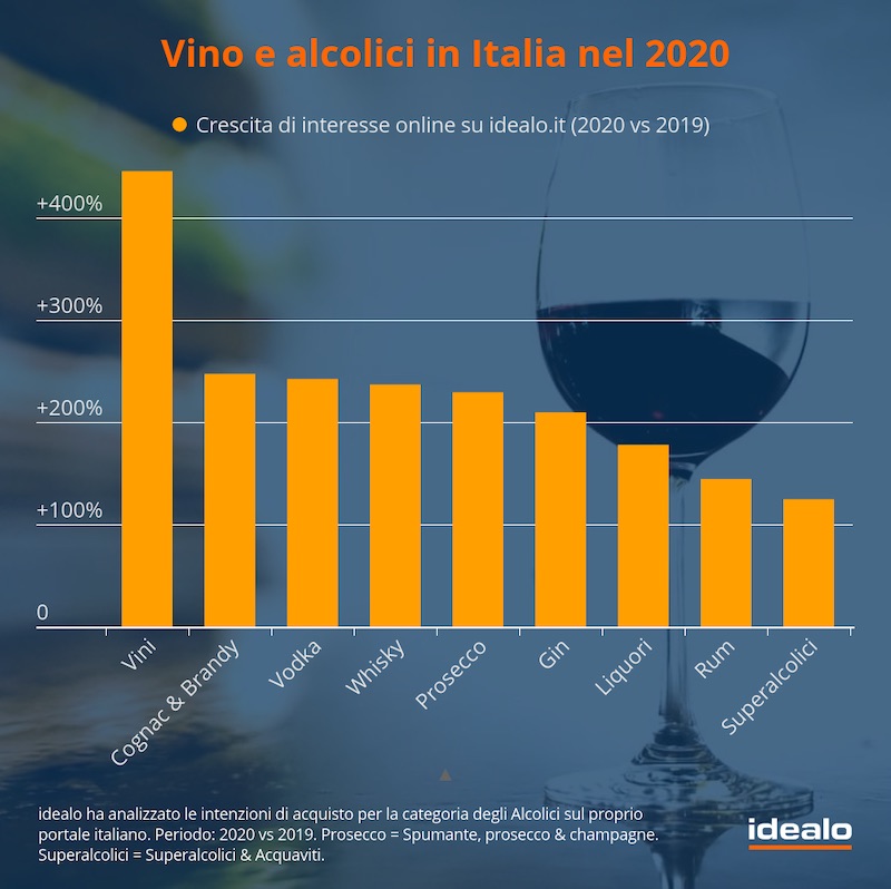 Ma quali alcolici hanno cercato di più online gli Italiani nel 2020? Secondo i dati dell’ultima ricerca di idealo, nell’ultimo anno si è assistito ad un vero e proprio boom di interesse online da parte degli Italiani nei confronti dei Vini (+446,0%), seguiti da Cognac e Brandy (+247,6%) e Vodka (+242,7%).