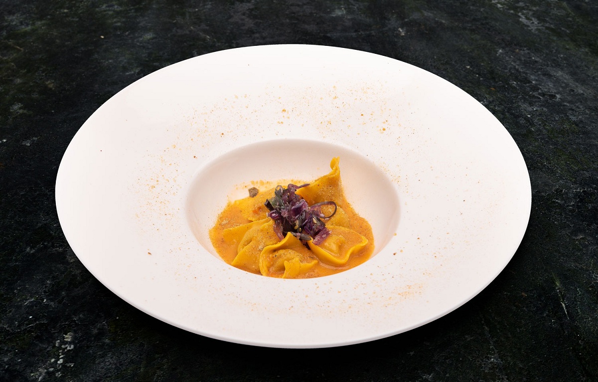 Ecco il suo piatto vincitore “100% Stoccafisso: Tortelli allo stoccafisso, brodetto e trippa di baccalà, alga wakame e cappuccio viola”