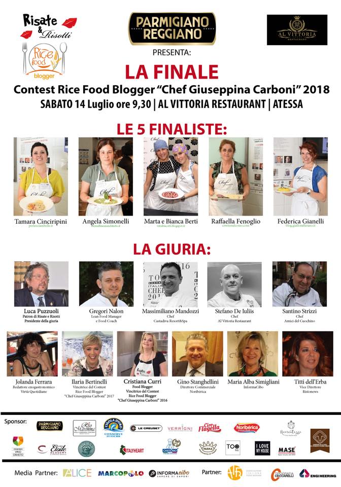 La gara sarà preceduta da un cooking show e ai fornelli, venerdì 13 luglio alle ore 19, si esibiranno in un Risotto Cristiana Curri (del Blog Le Chicche di Cristiana Vincitrice del Contest 2016) ed Ilaria Bertinelli (del Blog Uno Chef per Gaia vincitrice del Contest 2018) che prepareranno un risotto Parmigiana Romana con melanzane, pomodoro Ciro Flagella, mantecato con Parmigiano Reggiano, olio Infinito, servito con stracciatella e Prosciutto di Parma croccante. Premio Lo Chef del Risotto 1 Edizione.