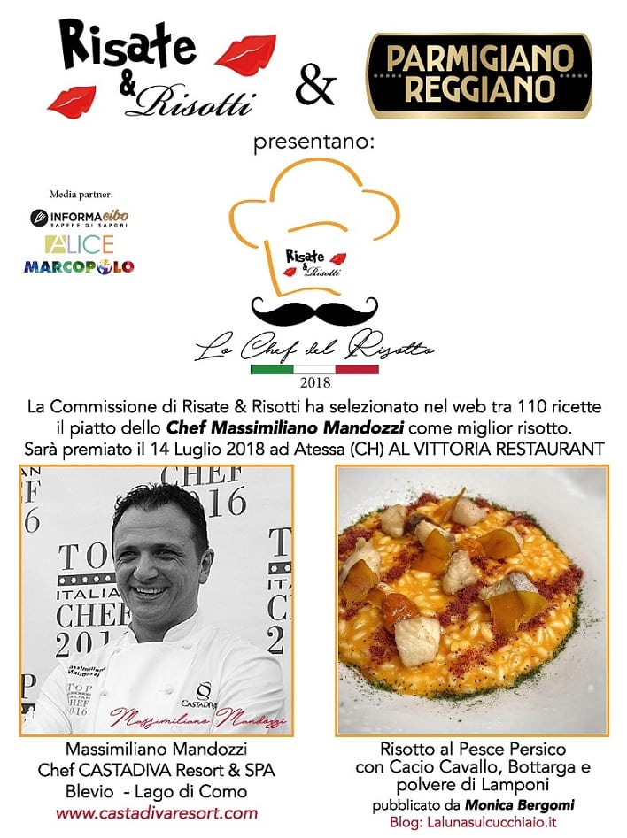 La commissione di Risate&Risotti ha selezionato dal web 110 ricette, il Risotto vincitore è risultato quello di Massimiliano Mandozzi, chef alla guida dell’ Orangerie del Casta Diva Resort e Spa sul lago di Como.