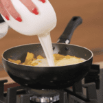 Quasi al termine della cottura aggiungo la scamorza tagliata a pezzettini e il restante Champagne.