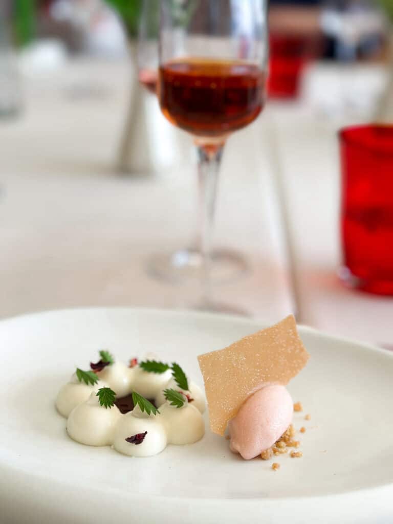 I dessert sono freschi e dai sapori delicati, terminano con un velo di dolcezza il pasto, senza risultare stucchevoli o pesanti: ci sono lo Spritz in versione sorbetto e una pannacotta al profumo di rosa, pesca e Franciacorta, un Bellini versione dessert.