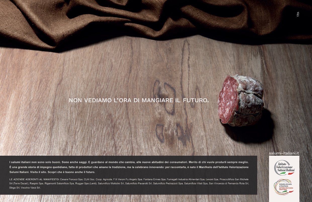 Da qui, la necessità di avviare una campagna di comunicazione per gli operatori del settore, che informasse dell’esistenza del Manifesto e della possibilità di sottoscriverlo, seguendone le regole ed impegnandosi in un percorso di evoluzione aziendale, con un nuovo senso di responsabilità sociale. La campagna stampa ha come claim: “NON VEDIAMO L’ORA DI MANGIARE IL FUTURO” e cerca di trasmettere la voglia di andare avanti, di guardare al futuro con positività, per un settore che pur essendo intriso di storia, non ha mai smesso di innovare, e anche in questo momento storico, cerca il modo di adeguarsi alle nuove esigenze del consumatore, nel rispetto della tradizione che lo contraddistingue. La campagna stampa, con una creatività elaborata per IVSI dall’agenzia Tita, prevede uscite su quotidiani, periodici e testate specializzate a partire dal 26 novembre e per tutto il mese di dicembre.