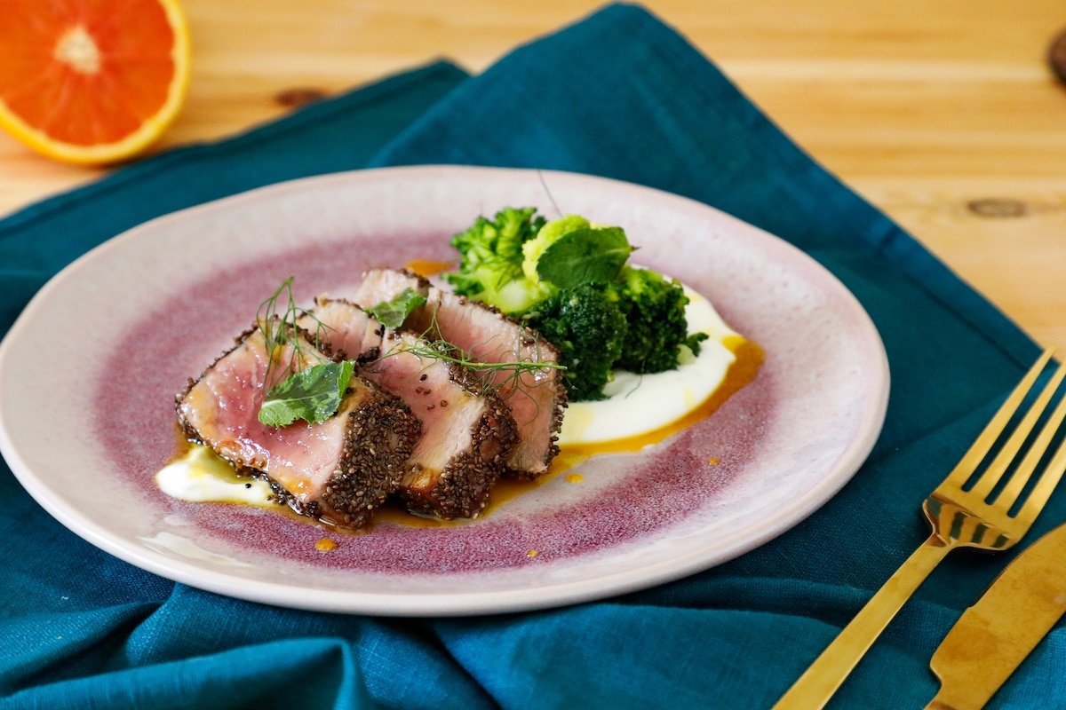 Tataki di tonno con verdure brasate, crema di yogurt e riduzione all’arancia