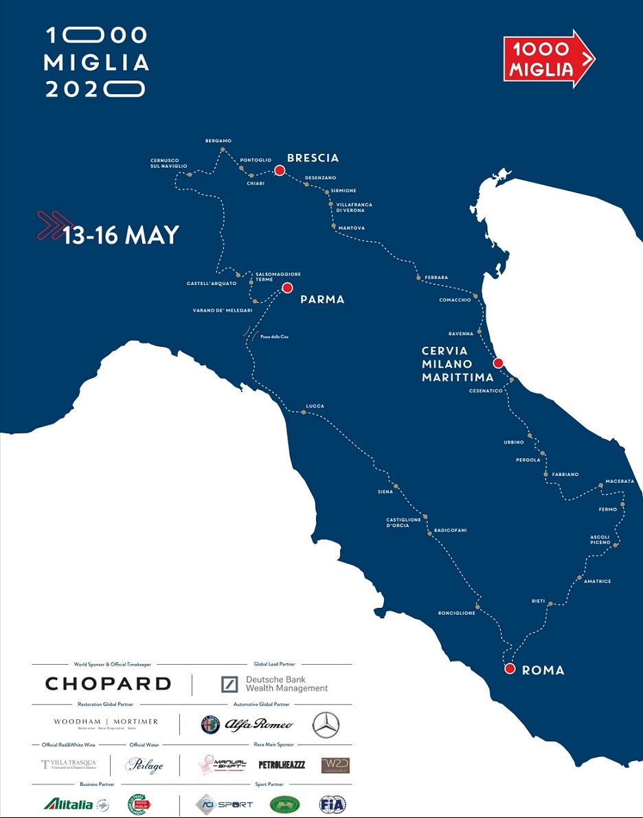 Le vetture partiranno da Brescia alla volta di Cervia-Milano Marittima, per poi raggiungere Roma, Parma e fare ritorno a Brescia. Oltre 400 equipaggi in gara provenienti da 30 Paesi del mondo si ritroveranno a Brescia giovedì 22 ottobre ai blocchi di partenza per un viaggio tra i paesaggi più suggestivi e belli d’Italia.