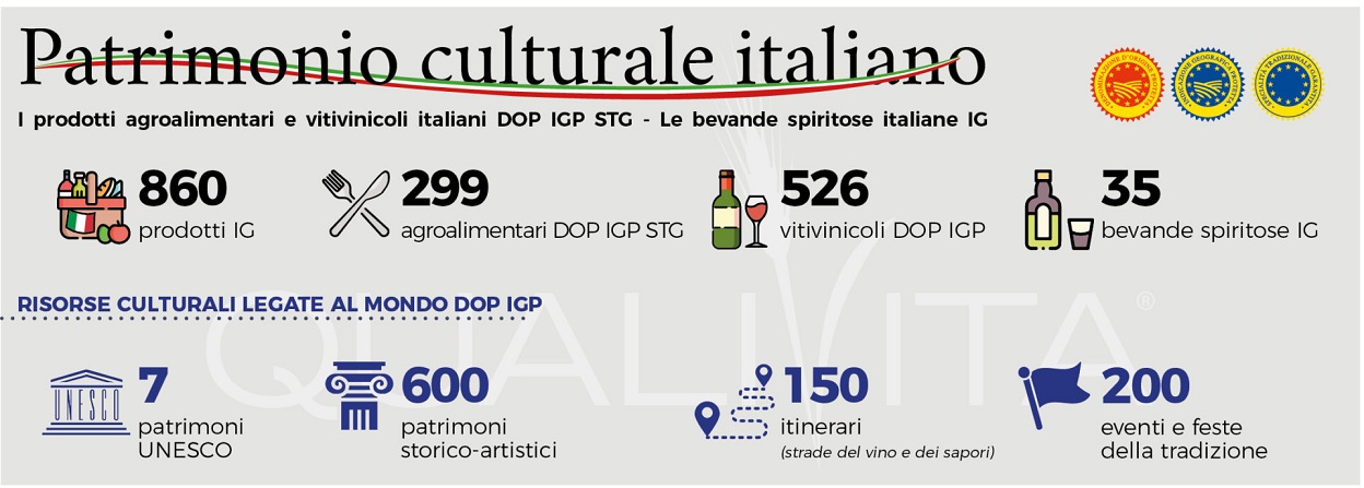 Un patrimonio inestimabile, quello delle Indicazioni Geografiche italiane, che emerge anche dalle indagini realizzate da Ismea e Qualivita che hanno mappato oltre 600 Risorse Culturali – Beni architettonici e artistici fino alle opere letterarie – più di 200 Eventi incentrati e 150 Itinerari tutti intimamente legati alle produzioni Dop Igp.