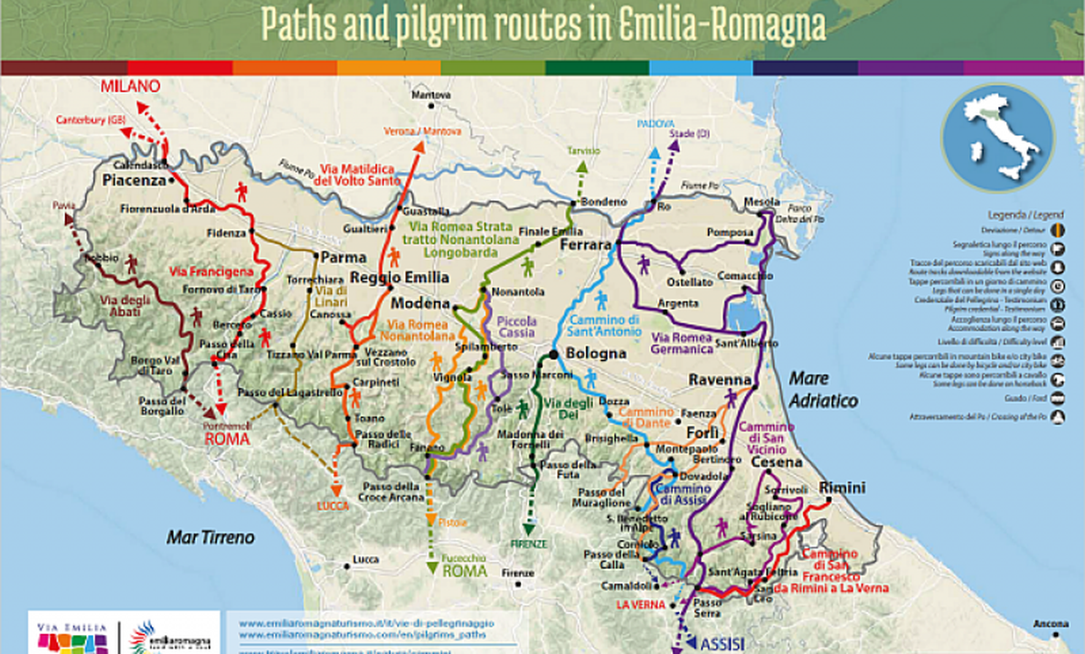 , e della attivazione del Tavolo regionale del Turismo Religioso, il Circuito regionale che coinvolge i 14 Cammini e 24 operatori turistici specializzati si è arricchito della collaborazione dell’Ufficio Pastorale del Turismo.Tra le iniziative del Circuito regionale da quest’anno ci sono oltre 30 pacchetti, presenti sul sito http://www.emiliaromagnaturismo.it che riguardano diversi tra i 14 Cammini e Vie dei Pellegrini, proponendo escursioni giornaliere a piedi o in bici, con soggiorni da 1 a 7 notti con o senza guida, tra natura incontaminata, luoghi di culto e borghi storici, antiche pievi, centri termali e aziende di produzione enogastronomica. APT Servizi Emilia Romagna e l’Assessorato regionale al Turismo, in collaborazione con l’Assessorato all’Agricoltura dell’Emilia Romagna, hanno inoltre lanciato il progetto per la realizzazione della “Bisaccia del Viandante”, con cui si mira a valorizzare e promuovere le produzioni tipiche dei territori toccati dai Cammini.