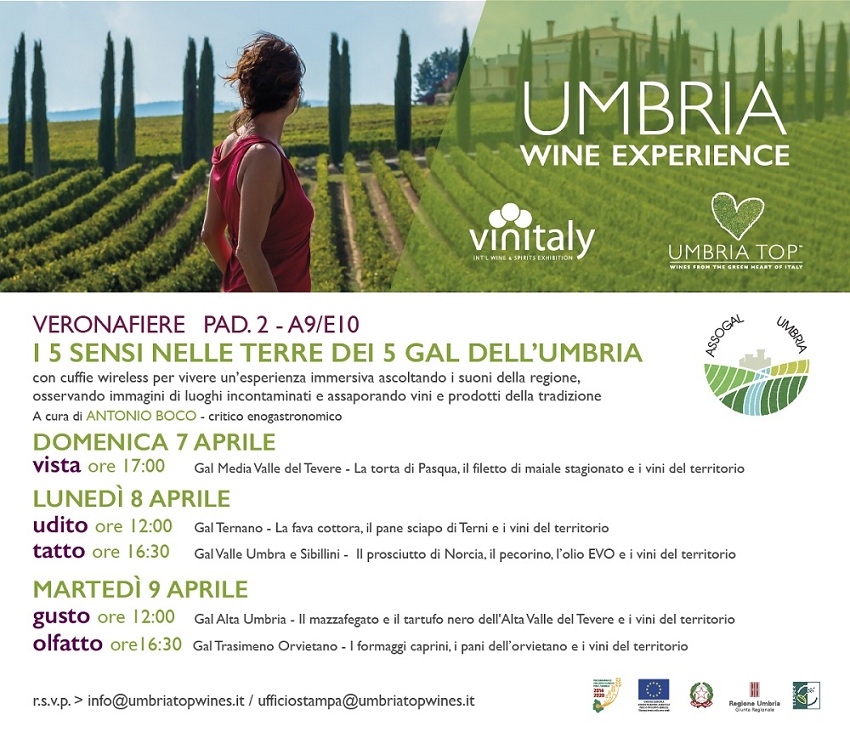 Vino e cibi di territorio (il prosciutto di Norcia, l’olio extravergine di oliva, il pecorino della Valnerina, il mazzafegato dell’alta valle del Tevere, la torta di Pasqua con il filetto stagionato della media valle del Tevere, il pane di Terni, l’acqua oligominerale delle Fonti di Sassovivo, il tartufo nero di Gubbio, i formaggi caprini e i pani di grani antichi dell’orvietano) quindi saranno sotto i riflettori in nome dei 5 sensi (olfatto, vista, gusto, tatto e udito) grazie alla collaborazione con Assogal Umbria. A far emergere punti di contatto e differenze saranno le degustazioni “I 5 sensi nelle terre dei 5 Gal” (Media Valle del Tevere, Ternano, Valle Umbra e Sibillini, Alta Umbria, Trasimeno-Orvietano) con i vini del territorio che prenderanno a braccetto i prodotti enogastronomici più interessanti di ogni zona secondo percorsi enogastronomici guidati dal critico Antonio Boco. Ma non solo. Attraverso speciali cuffie wireless si potrà vivere contemporaneamente un’esperienza immersiva ascoltando i suoni della regione, osservando immagini di luoghi incontaminati e assaporando prodotti della tradizione.