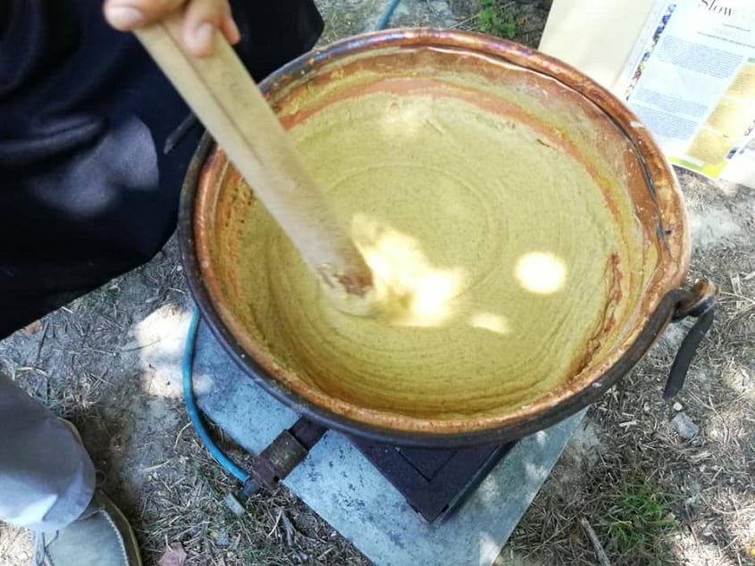 Proprio in queste zone, grazie ad Angelo Serri, ideatore di Tipicità ed esperto di marketing territoriale e all’Unione montana Esino Frasassi, abbiamo incontrato, insieme ad un gruppo di giornalisti, un cuoco/contadino/imprenditore, Marino Montalbini, che davanti ad una polenta, quella vera, fumante e gustosa ci ha dato una lezione storica, economica e gastronomica di questo piatto preparato con il mais ottofile di Roccacontrada: un bene povero che nel tempo è diventato di gran pregio, la dimostrazione concreta di quanto un cibo, il mais, chiamato volgarmente granturco, possa diventare, se ben recuperato e valorizzato, una ricchezza per una comunità e un valore per un territorio.