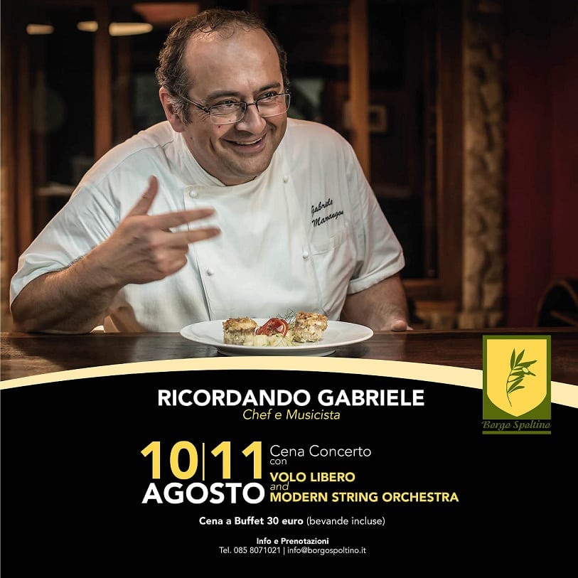 Venerdì 10 e Sabato 11 agosto nel Country House Borgo Spoltino di Mosciano Sant’Angelo in provincia di Teramo, verranno dedicate due cene concerto al ricordo di Gabriele Marrangoni, l’anima del Borgo, lo “Scief” che ha promosso l’Abruzzo, la sua cucina e i prodotti del territorio al di là dei confini della sua regione, fino ad arrivare in Brasile.